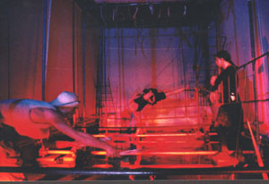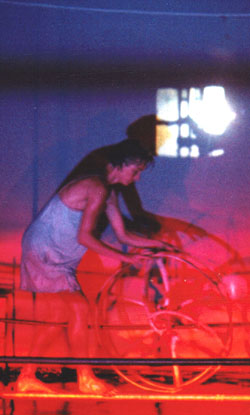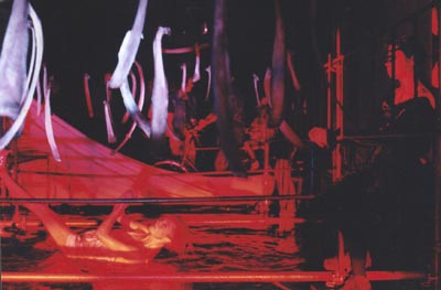 This was the Silo Theater's first production for the Parade festival. Projections, movement artists, bones, iron ladders and other objects were combined in an ongoing performance in which the public (2000 people over 17 days) sat in a carrousel and viewed 'kijk doosjes' (small boxes with objects and scenes) before being presented with a horizontal view of the shaft of a grain silo, inspired by the then home of the group and founding place, De Graan Silo, Amsterdam.