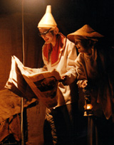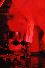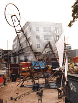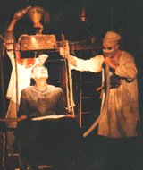The public has to cross the drawbridge, walking under the mad captain, above him the fire juggling woman who will later lay the egg to make the pancake. Captive in the strange world of the workers, they observe the bizarre ritualistic process unfold, not always without a comic hitch or two. The pancake travels a long way from egg to pan, and is finally eaten by a member of the public, after having been sugar-powdered during a sadistically induced ride on the lap of the factory idiot, tied to a motorized metal chair on rails.