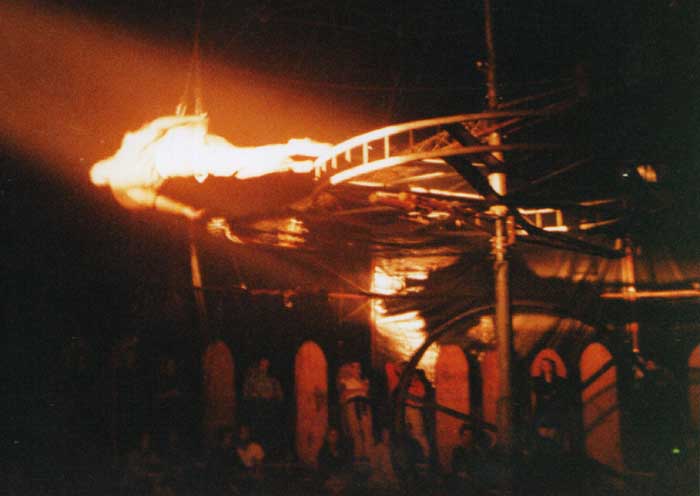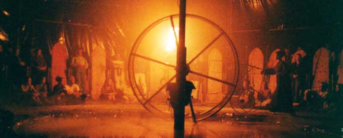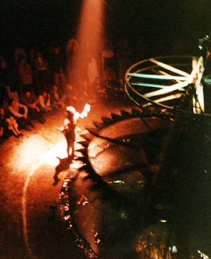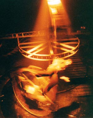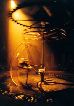 A specially modified 16 meter diameter tent holds a ring of 56 reclining chairs facing up and towards the central mechanism. Here the audience is treated to Silo's special blend of jump-cut sceneography, whilst slowly tilting back (each chair is individually restrained by a slow moving water resistance mechanism).